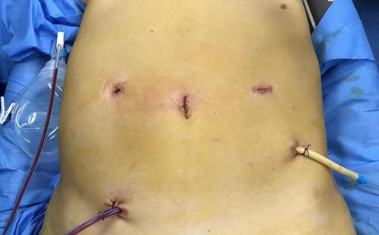术后8小时,洪先生麻醉清醒了,护士为他拔除了胃管。术后第一天早8点,洪先生开始下床走动,同时成功拔除尿管自行排尿。当天,医生查房时,洪先生开心地说,“没有预想的疼,也果真没留下长刀疤。感谢你们!”术后7-9天时,洪先生先后拔除腹部引流。术后第10天,洪先生康复出院。